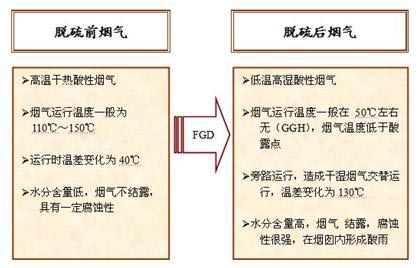 煙氣經(jīng)過(guò)脫硫后,雖然煙氣中的二氧化硫的含量大大減少,但是,洗滌的方法對(duì)除去煙氣中少量的三氧化硫效果并不好。由于經(jīng)濕法脫硫,煙氣濕度增加、溫度降低,煙氣極易在煙囪的內(nèi)壁結(jié)露,煙氣中殘余的三氧化硫溶解后,形成腐蝕性很強(qiáng)的稀硫酸液。